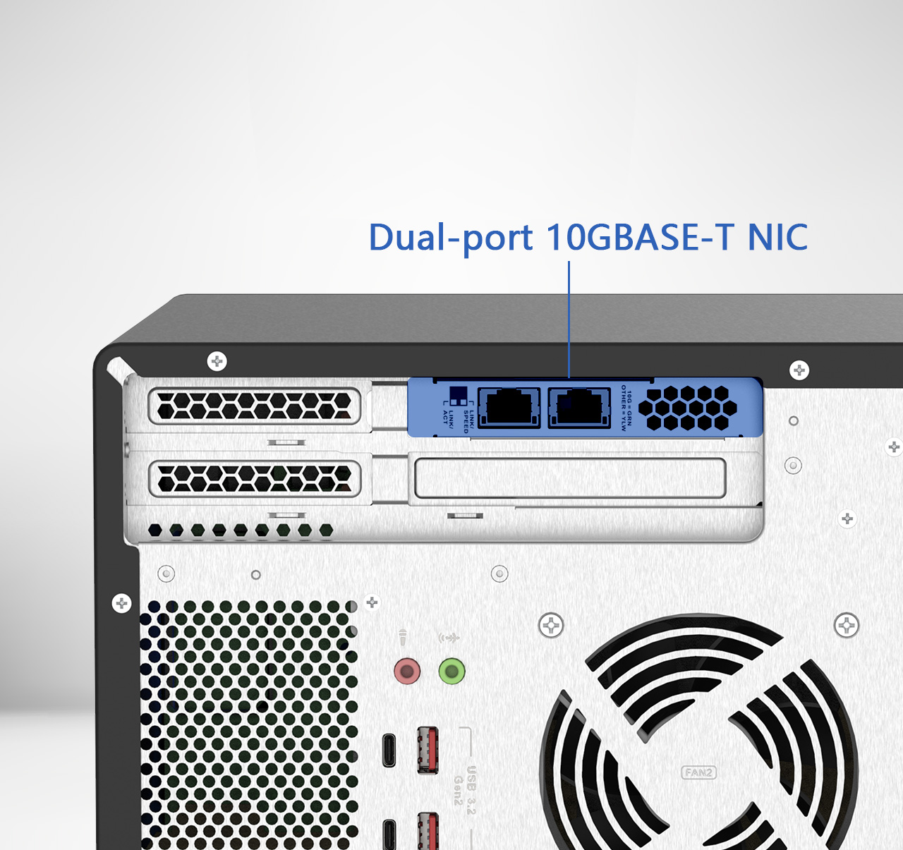 • 2 個 10GBASE-T 與 4 個 2.5GbE 網路埠,加速虛擬機應用、密集檔案存取、高速備份/還原、以及影音傳輸。