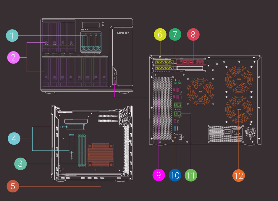 TVS-h1688X 內建 4 個 2.5 吋 SATA 6Gb/s SSD 專用槽與 2 個 M.2 NVMe Gen 3 x4 SSD (尺寸 2280/22110) 專用埠,可彈性配置 SSD 快取加速,提升磁碟隨機存取效能、減少 I/O 延遲,尤其適合高度 IOPS 效能的應用 (如:資料庫、虛擬機),亦可激升 2.5GbE/10GbE 最佳存取速度。毋須占用 3.5 吋硬碟槽,輕鬆享有儲存空間極大化、效能最佳化的好處。