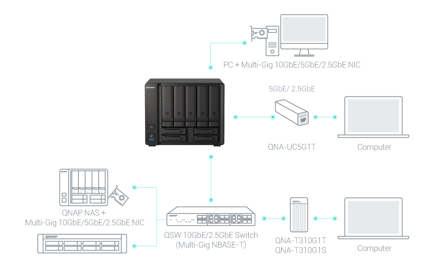 TS-h973AX 提供 1 個 10GBASE-T Multi-Gig (10G/5G/2.5G/1G/100M) 網路埠與 2 個 2.5GbE RJ45 (2.5G/1G/100M) 網路埠,支援 Port Trunking 與故障轉移,為企業應用帶來大頻寬傳輸的優勢,充分滿足企業對大量檔案存取、備份和復原、影音傳輸與編輯等高頻寬作業的需求。搭配 QNAP 旗下多款網管型和非網管型 10GbE/2.5GbE 交換器,用精省預算打造流暢、安全、可擴充的高速網路環境。QNAP 也提供 Windows® / Linux® 個人電腦以及工作站等設備適用的 10GbE/5GbE/2.5GbE 網路擴充卡與 USB 5GbE 網路轉換器,讓傳輸效能倍數升級,團隊協作更有效率,享有最佳化儲存體驗。